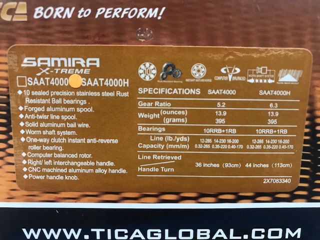 | SAAT4000H | CARRETO TICA SAMIRA 4000H 6.3 | 6.3:1 | 395g | 10+1 | 113cm | 0.32-265 | 1x ALUMINIO | 10kg |