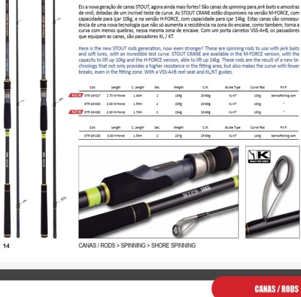Eis a nova geração de canas STOUT, agora ainda mais fortes! São canas de spinning para jerk baits e amostras de vinil, dotadas de um incrível teste de curva. As STOUT CRANE estão disponíveis na versão M-FORCE, com capacidade para içar 10kg, e na versão H-FORCE, com capacidade para içar 14kg. Estas canas são consequência de uma nova tecnologia que não só aumenta a resistência na zona do encaixe, como também, torna a curva com menos quebras, nessa mesma zona de encaixe. Com um porta carretos VSS-A+B, os passadores que equipam as canas, são passadores KL / KT. Here is the new STOUT rods generation, now even stronger! These are spinning rods to use with jerk baits and soft lures, with an incredible test curve. STOUT CRANE are available in the M-FORCE version, with the capacity to lift up 10kg and the H-FORCE version, able to lift up 14kg. These rods are the result of a new technology that not only provides a higher resistance in the fitting area, but also makes the curve with fewer breaks, even in the fitting zone. With a VSS-A+B reel seat and KL/KT guides. Cod Length C. Length Sec. Weight C.W. Guide Type Curve Test P.V. P. NEW NEW 075-19-027 075-19-030 075-19-033 2.70 M-Force 3.00 M-Force 3.30 M-Force 1.40m 1.55m 1.70m 2 2 2 185g 205g 234g 20-60g 20-60g 20-60g KL-KT KL-KT KL-KT 10Kg 10Kg 10Kg barrosfishing.com “ “ Cod Length C. Length Sec. Weight C.W. Guide Type Curve Test P.V. P. 075-19-230 3.00 H-Force 1.55m 2 237g 25-80g KL-KT 14Kg barrosfishing.co